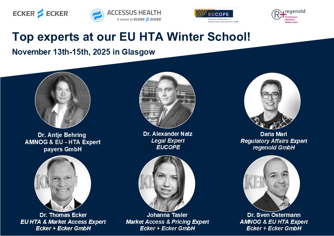 Ecker + Ecker pflegt gemeinsam mit der auf den europäischen Markt spezialisierten Accessus Health ein umfassendes europäisches Partnernetzwerk aus lokalen Experten, das für 30 europäische Länder die jeweils nationale Perspektive rund um Market Access und EU-HTA eröffnet.